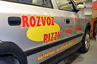 - jednoduchý polep aut pro rozvoz pizzy. Lepení všech bočních dveří, zadní části a kapoty motoru obou vozů.